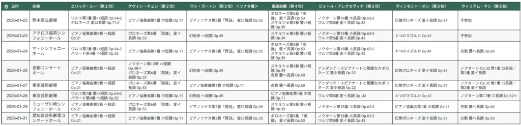 | 2026-01-22 | 熊本県立劇場 | ワルツ第7番 嬰ハ短調 Op.64-2 ポロネーズ 変ロ長調 Op.71-2 | ピアノ協奏曲第1番 ホ短調 Op.11 | ピアノソナタ第2番「葬送」 変ロ短調 Op.35 | ポロネーズ第6番「英雄」 変イ長調 Op.53 スケルツォ第3番 嬰ハ短調 Op.39 | ノクターン第18番 ホ長調 Op.62-2 ワルツ第5番 変イ長調 Op.42 | 幻想ポロネーズ 変イ長調 Op.61 | 不参加 |